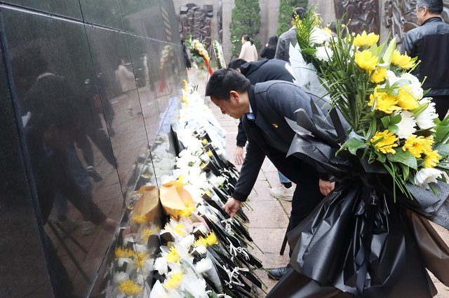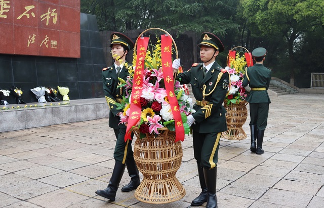 云居山麓,青松挺立、翠柏环抱,上午9时许,在巍然耸立的烈士纪念碑前,全体党员干部佩戴党员徽章,手持菊花,神情肃穆。