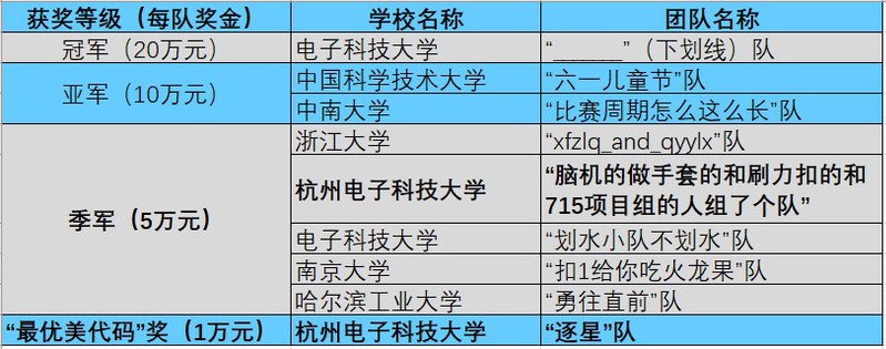 经过激烈角逐,我校计算机学院硕士生张家政、白植权、杨心宇组成的“脑机的做手套的和刷力扣的和715项目组的人组了个队”与浙江大学、电子科技大学、南京大学、哈尔滨工业大学5支队伍获得季军。我校计算机学院硕士生周志奇、任庆、王立耀组成的“逐星”队赢得“最优美代码”奖。