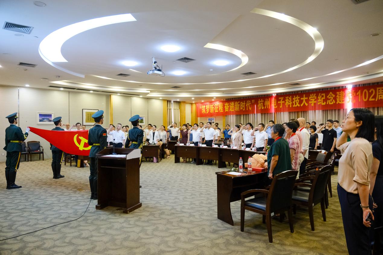 会上表彰了一年来在学校党的建设和改革发展中涌现出的先进集体和优秀个人。网络空间安全学院信息安全党支部书记吴国华、计算机学院图像所党支部书记徐岗、机械工程学院安吉研究院支部书记许明、机关党委书记袁秀川作为获奖代表发言。离退休党员为新发展党员代表佩戴党员徽章、赠送党章。毛文源、张莹、吴雪燕、宋树林四位老中青党员朗诵《党旗飘扬》,为建党102周年献礼。