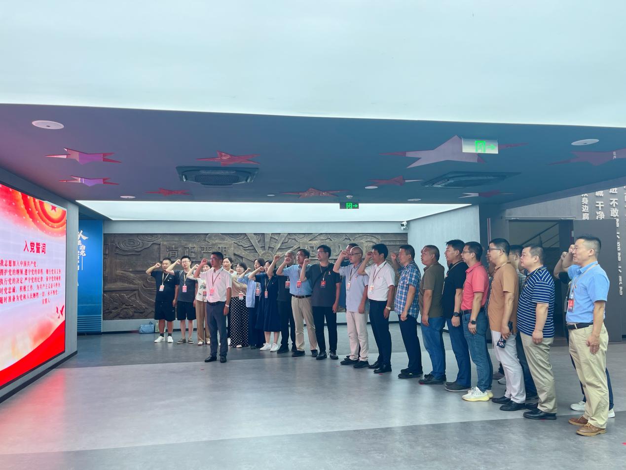 在展馆大厅内,中心党委书记王劲峰带领党员干部在宣誓墙前重温入党誓词。