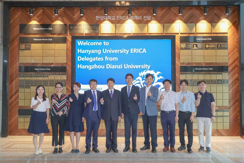 在汉阳大学期间,代表团受到汉阳大学副校长Dong-Hyun Baek、国际处部长Dongil Kim、工学院电子工学部负责人Haewoon Nam教授、Youngjin Choi教授、Hu Jin教授等的热情接待。Baek副校长代表学校欢迎杭电代表团的到来,他介绍汉阳大学以理工科为特色,是韩国公认的一流学、研、产集群大学,也是韩国BK21工程卓越高校,学校综合排名位居韩国高校前五,国际化排名位居韩国高校第二。吕金海介绍了我校的基本概况、办学历史和办学特色,他指出国际化和师资队伍建设是学校发展的两大战略,希望通过此次访问,两校未来能有更紧密的合作,特别是在计算机、电子、自动化、通信等双方优势学科加强两校教学和科研深度合作。