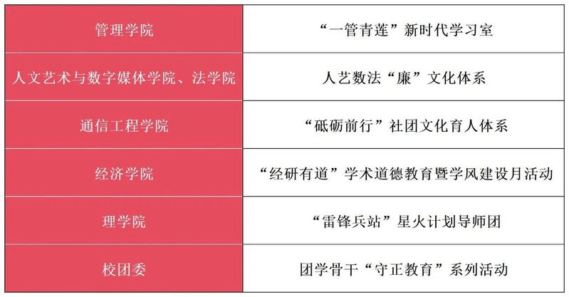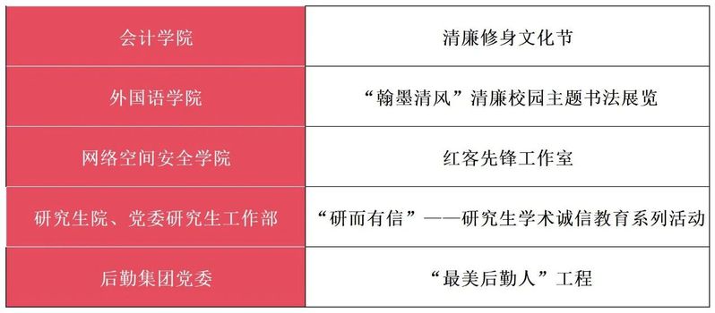 近年来,学校大力夯实廉政文化之“基”,将廉政文化教育与深入学习贯彻习近平新时代中国特色社会主义思想相结合,引导教育广大党员干部和师生增强筑牢思想根基;大力厚植廉政文化之“壤”,开展了“六个一”系列活动,举办廉政文化主题活动等200余场;大力塑造廉政文化之“品”,推进“一学院一品牌”“一部门一方案”建设,构建了金品牌、建设项目、培育项目“三层三级”的金字塔型廉政文化品牌建设体系。在校党委、纪委的领导下,经过全校师生的共同努力,学校向上、向善、向廉的廉政文化氛围不断浓厚,干部清廉从政、教师清廉从教、职工清廉从业、学生清廉修身的清廉文化蔚然成风,为推动全面从严治党向纵深发展、学校事业快速发展筑牢了清廉之基。