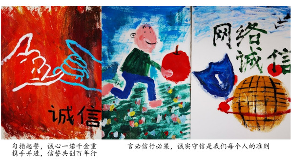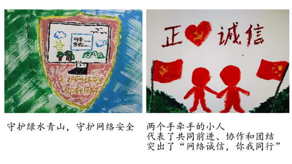 随后,大家分成小组,围绕“正心诚信,你我同行”主题进行自由创作。拿起久违的画笔,沾取缤纷的颜料,同学们思如泉涌,迫不及待地绘出自己心中的清朗网络空间。“以拉钩确认承诺,共建共护网络安全”、“网络诚信是你我,更是世界上每一个人需要携手维护的事”、“打造具有中国红特点的正心诚信”......每一幅画作的背后都是一份美好的期许,也是为维护网络安全许下的一份沉甸甸的承诺。