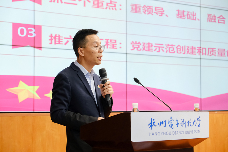 王兴杰强调,党支部是党的基础组织,是我们党开展各项工作的前沿和关口,也是我们党密切联系群众的纽带、教育管理党员的阵地、攻克各种困难的堡垒。加强党支部建设,务必要做到五个“强化”和五个“过硬”。一要强化政治建设,做到政治过硬,切实树牢“四个意识”,坚定“四个自信”,坚决做到“两个维护”,自觉履行全面从严治党责任。二要强化宗旨意识,做到服务过硬,树立良好服务意识,提高服务水平,不断增强支部凝聚力和向心力。三要强化实干担当,做到本领过硬,坚持把党建与业务同规划、同部署、同推进、同考核,谋划好“干什么”,制定好“怎么干”,实现“干得好”的要求。四要强化创新思维,做到能力过硬,依托电子信息特色优势,建强党群服务中心和党建智治阵地,提升“线上+线下”数字化管理能力。五要强化奉献廉洁,做到作风过硬,党支部书记要带头树立正确的价值观、利益观、群众观和纪律观,为师生树立榜样。王兴杰要求全校党员干部,紧紧围绕学校中心工作,把使命放在心上,把责任扛在肩上,把工作落到行动上,带头履职尽责,带头担当作为,为学校高水平大学建设,助力共同富裕省域先行、打造“重要窗口”展现杭电担当、贡献杭电力量。