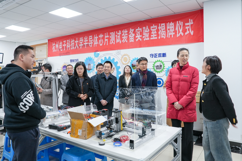 在机械工程学院半导体芯片测试装备实验室,正在埋头准备竞赛的同学们向大家讲解实验室里的研究项目,并现场演示实验室仪器的应用场景。其中,实验室里全自动12寸探针台,通过同学们的编程,在晶圆上一针一针地扎出图案,生动地刻画出了周苏红当年在比赛时发球的场景。