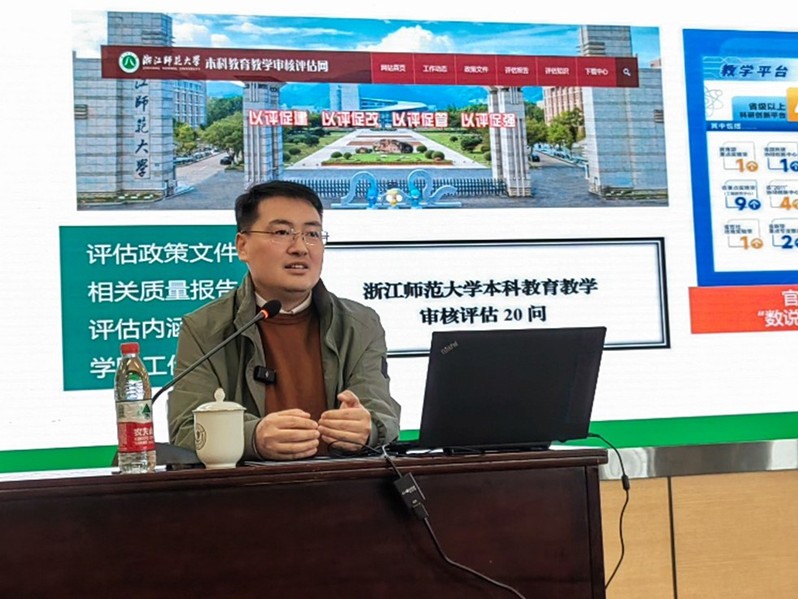 乔思辉从新一轮审核评估内涵要义、指标体系及新变化的解读出发,阐述了对新一轮审核评估的理解,全面细致地梳理了院系评估考察要点、方式方法及注意事项,详细介绍了自评报告、示范案例撰写以及“3+3+1”报告的准备等重点工作。他还结合浙江师范大学评建工作实践,分享了审核评估工作过程中的经验、做法和心得体会,并探讨了审核评估对学校发展的多方面促进作用。