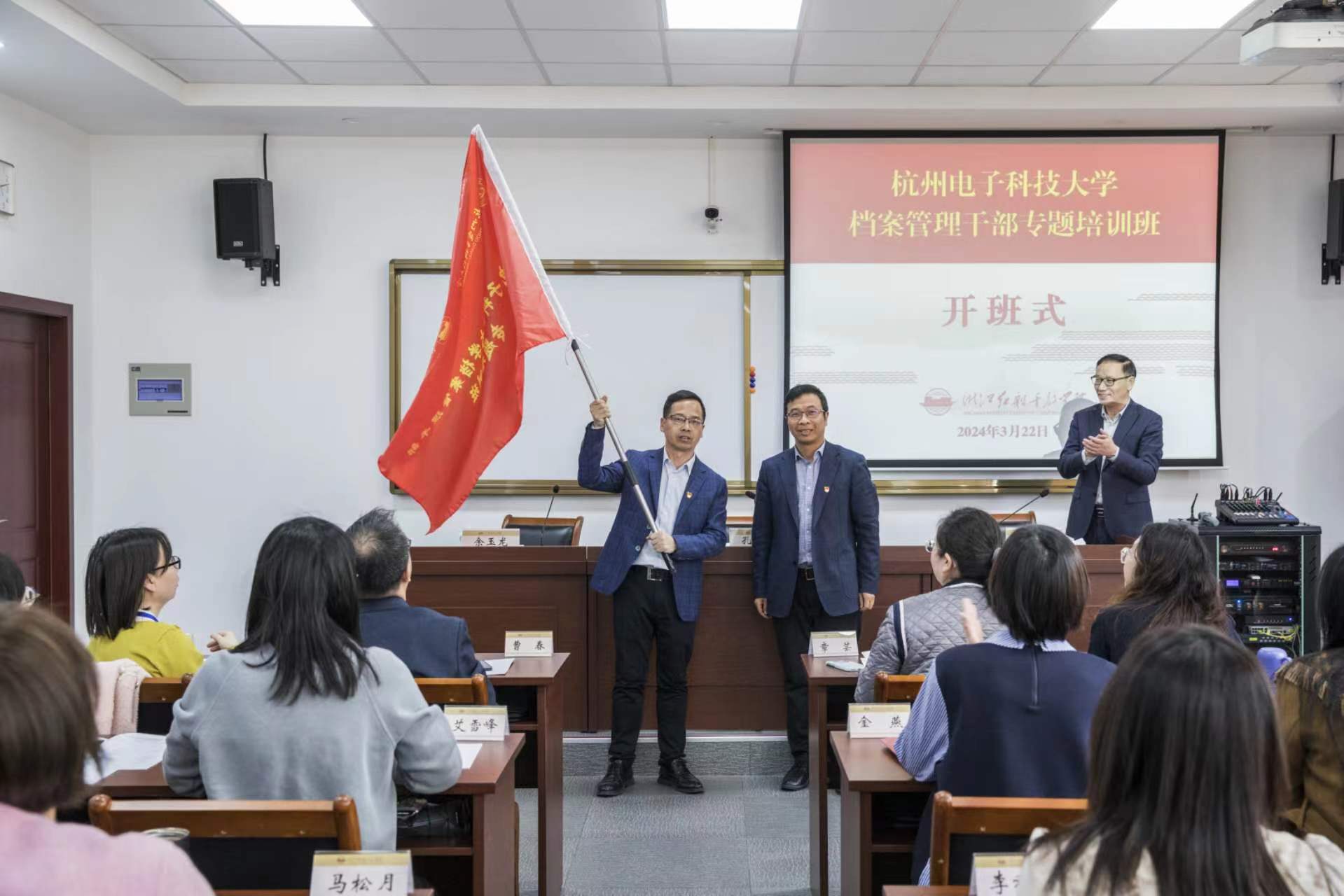 孔万增作开班动员讲话。他指出,档案工作是一项崇高的事业,发挥着记录历史、传承文明、资政育人的重要作用。学校历来高度重视档案工作和档案管理干部队伍建设,本次培训班是贯彻落实浙江省“新春第一会”和学校开学工作会议精神,将人才这一关键变量转化为发展最大增量的具体行动。各位学员要以从事档案工作为荣,自觉提高思想认识和政治意识,切实增强使命感和责任感;要珍惜学习机会,做到真学实学,学思悟融会贯通,有效提升依法治档、依规管档、高效服务能力;要严格遵守培训纪律、廉洁纪律和作息制度,共同维护健康和谐的学习氛围和积极进取的班级形象,确保本次教育培训取得圆满成功。随后,他为本次培训班授予班旗。