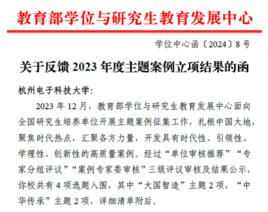 近日,由教育部学位与研究生教育发展中心来函获悉,教育部已公布2023年主题案例征集立项结果,经“单位审核推荐”“专家分组评议”“案例专家委审核”三级评议审核,我校4个主题案例项目获批教育部立项建设,其中“大国智造”2项,“中华传承”2项。