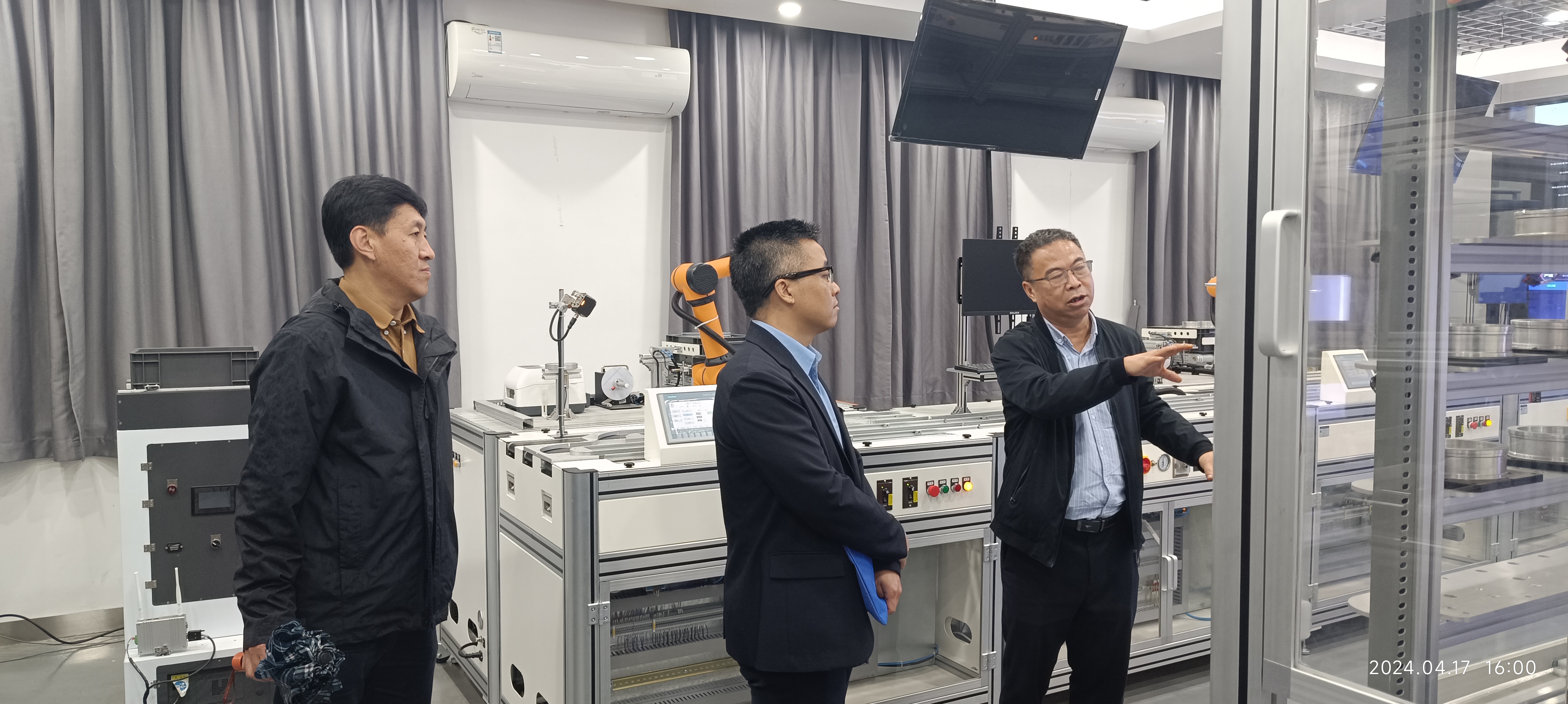 会后颜校长、侯平智主任陪同肖蔚处长一行实地考察参观了中奥“一带一路”联合实验室智能制造实训平台、智慧监测与生产安全平台、虚拟现实实验室以及云计算服务器,并观摩了智能制造流水线的演示。肖处长对实验室发展、软硬件研发成果及产业化推广给予高度评价。