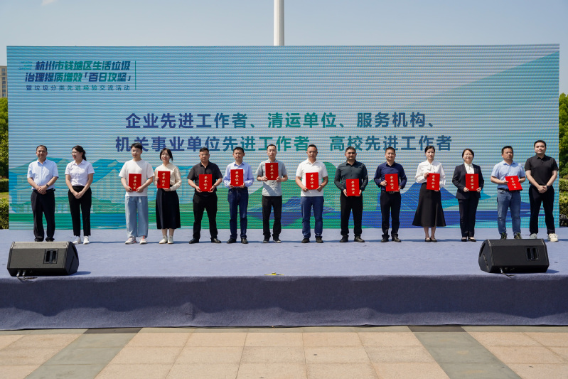 5月10日下午,由杭州市分类办、钱塘区人民政府主办,区分类办、区综合行政执法局、河庄街道承办的钱塘区生活垃圾治理提质增效“百日攻坚”暨垃圾分类先进经验交流活动在河庄街道健康广场举办。省分类办、市分类办、市环卫固废中心相关负责人出席活动,钱塘新区管委会副主任、钱塘区副区长胡国伟致欢迎词。会议表彰了2023年度杭州市钱塘区生活垃圾分类区级先进集体和个人,我校被授予“2023年度杭州市钱塘区生活垃圾分类工作先进学校”,陈宝刚、肖茜茜获评“2023年度杭州市钱塘区生活垃圾分类工作先进工作者”。