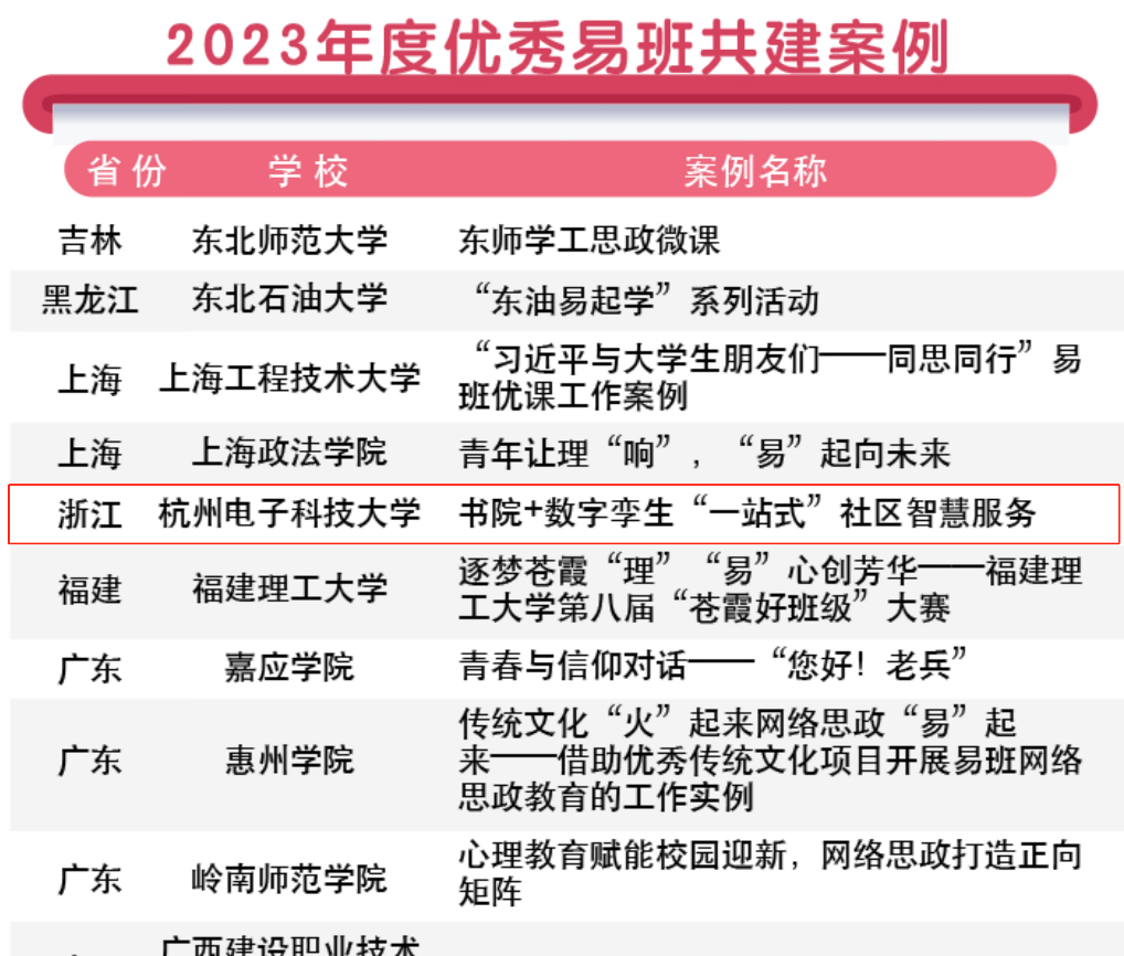近日,2023年度全国易班共建优秀名单公布。经教育部易班发展中心专家评委的严格评审,我校荣获2023年度优秀易班共建高校、黄颖老师撰写的《书院+数字孪生“一站式”社区智慧服务》获评2023年度优秀易班共建案例、杭电易班工作室负责人申智阳获评2023年度优秀易班工作站站长。我校已连续三年获得全国优秀易班共建高校。