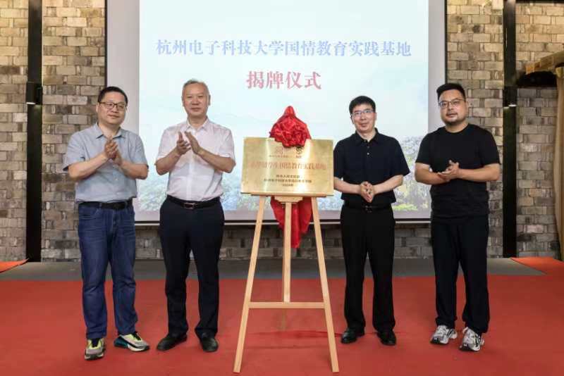 在文化园礼堂,天台县统战部部长庞伟峰、校党委副书记戚明钧、国际教育学院院长王一安、天台和合人间文化园负责人沈盛钢共同为久久精品一区二区国情教育实践基地揭牌。