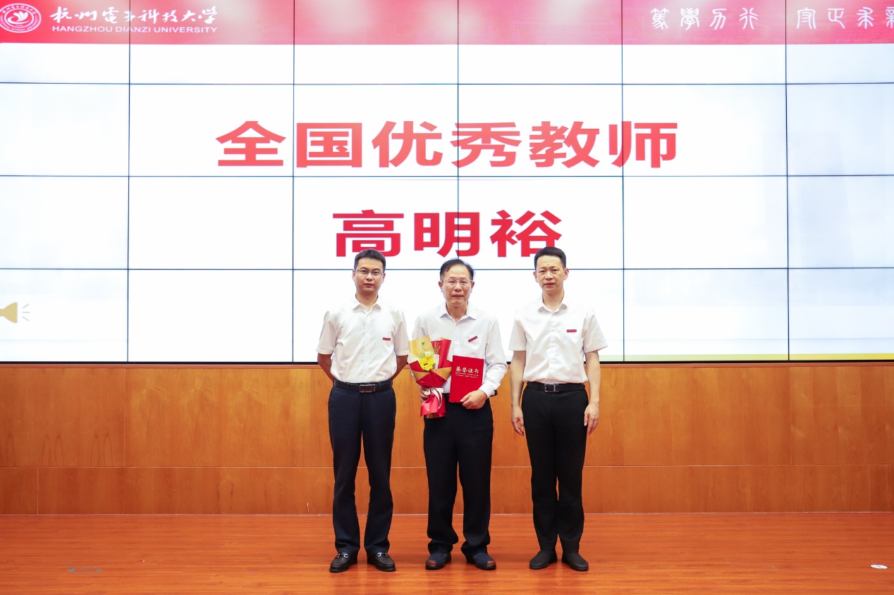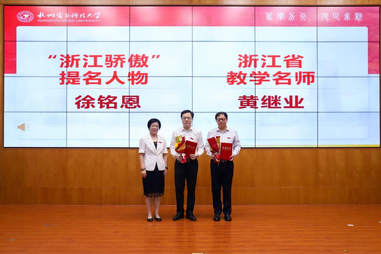 会议第二阶段进行先进教师表彰。校党委副书记戚明钧主持会议并宣读表彰人员名单。校党委书记吴卿、校长陈积明为全国优秀教师高明裕、国家教学成果奖获奖团队颁奖,纪委书记任蔚青为“浙江骄傲”提名人物徐铭恩、省教学名师黄继业颁奖。