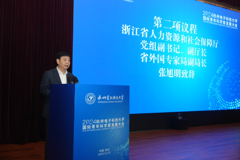 浙江省人力资源和社会保障厅党组副书记、副厅长,省外国专家局副局长张旭明现场致辞,他表示,人才是全面深化改革的动力源泉,也是创新驱动的核心因素。人才兴则事业兴,青年科学家是科技创新的新锐力量。期待各位青年才俊能够加盟杭电,融入浙江,聚焦发展新质生产力,主动对接省“315”科技创新体系和“415X”先进制造业集群建设方案,扎根创新沃土、勇攀科学高峰,为建成科技强国、加快实现高水平科技自立自强贡献智慧和力量。