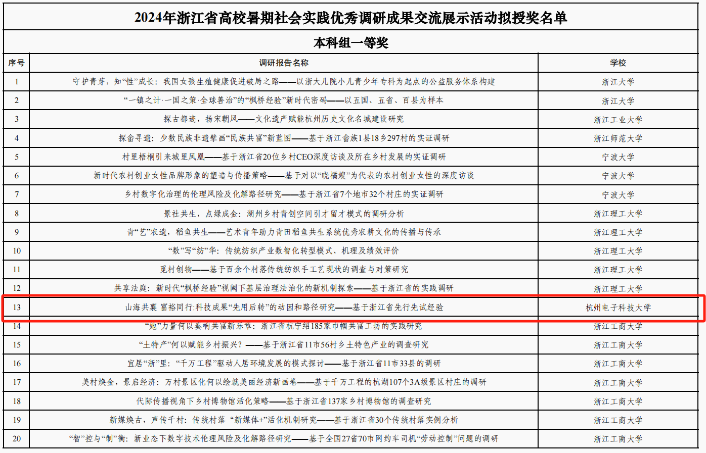 经文本评审、现场汇报、评委问辩等环节,共青团浙江省委公布《2024年浙江省高校暑期社会实践优秀调研成果交流展示活动拟授奖名单》,管理学院由李国冰、聂力兵、何平、李风啸老师指导,朱贤祈同学负责的《山海共襄 富裕同行:科技成果“先用后转”的动因和路径研究——基于浙江省先行先试经验》获一等奖。