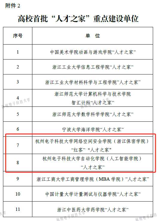 近日,中共浙江省委教育工作委员会办公室公布《高校“人才家园”建设工程首批重点建设单位名单》的通知(浙教工委办函〔2024〕30号),我校网络空间安全学院“人才之家”和自动化学院“人才之家”获批高校首批“人才之家”重点建设单位。