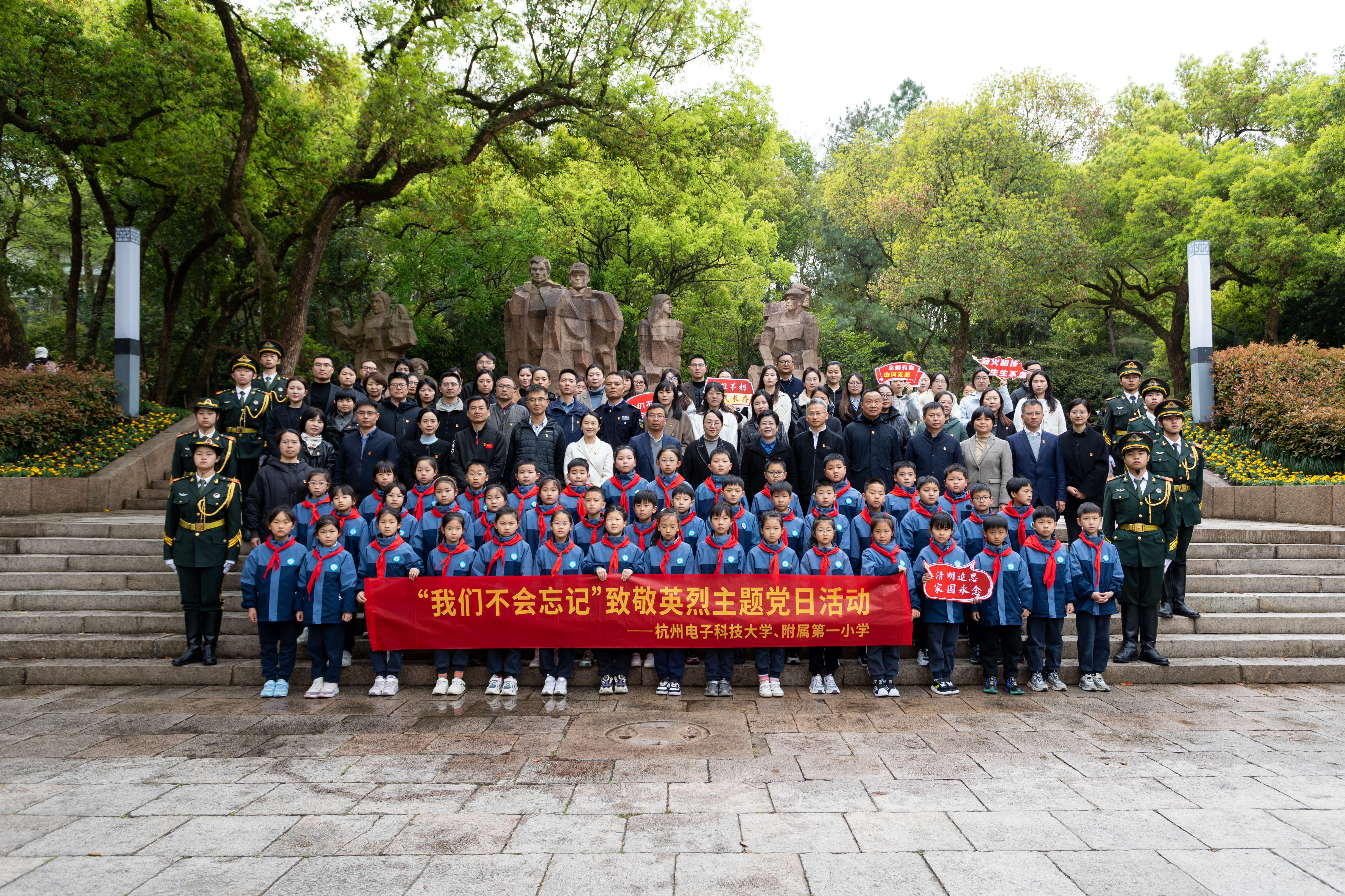 杭电师生党员代表与杭电附属一小的少先队员代表们,共同演绎诗朗诵《我们不会忘记》。全体共产党员重温铿锵誓词,大家缓步绕行瞻仰烈士纪念碑,敬献菊花。