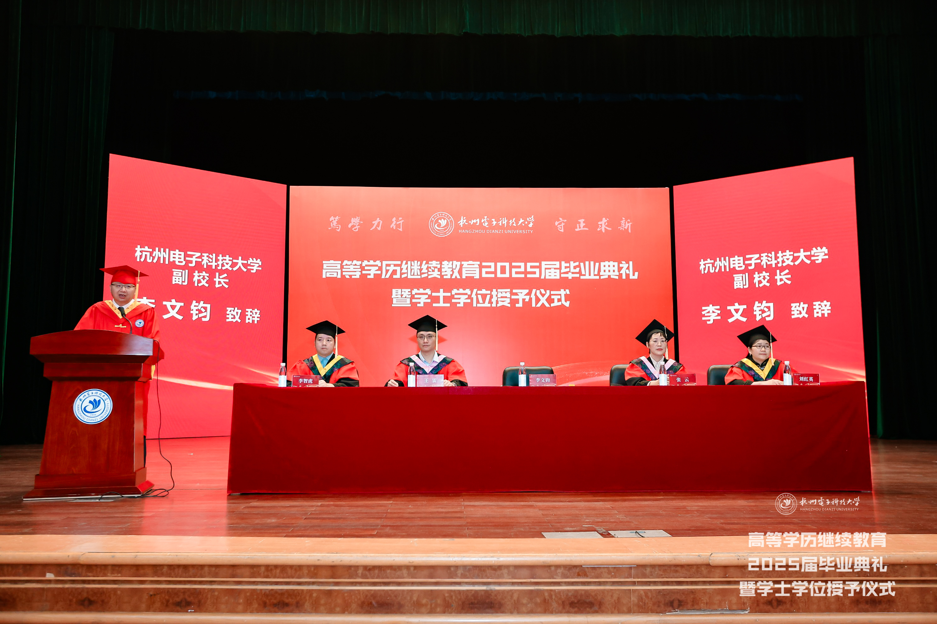 李文钧在致辞中代表学校向全体毕业生致以最热烈的祝贺和最殷切的期望。他寄语同学们三句话,愿大家带着杭电人的精神走向更广阔的人生舞台:一是让“勤学”成为一种生活方式,而不是阶段任务。希望同学们把每一次工作挑战当作“勤学”的机会,把每一个生活困惑视为成长的契机;二是“通变”是应对未来不确定性的关键,希望同学们在各自的岗位上,既能深耕专业,又能跳出专业,以“通变”的智慧应对外部变化;三是做一个有“担当”的杭电人,希望同学们时刻谨记杭电人的身份,在祖国和人民最需要的地方,彰显杭电人的使命与担当。