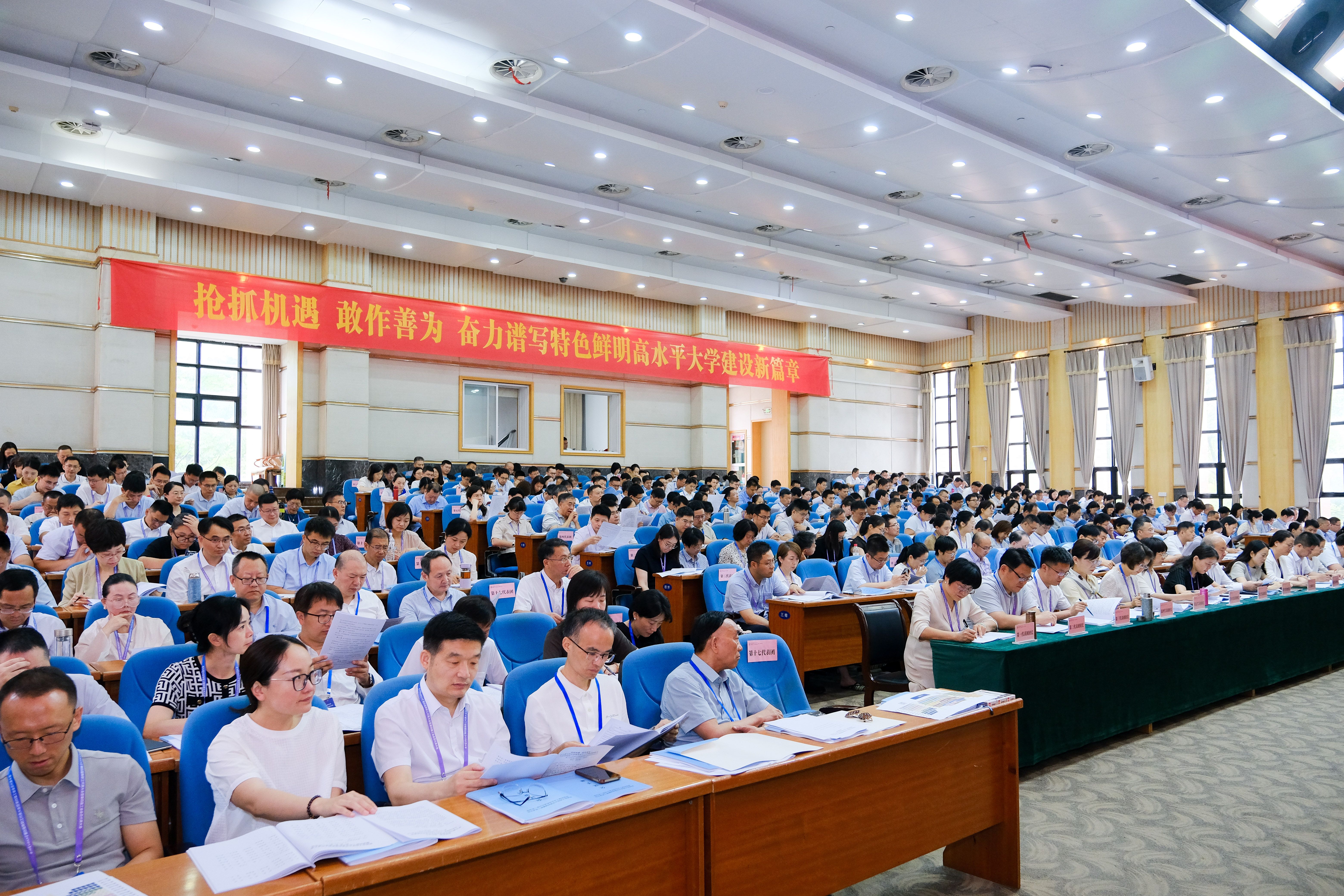 校长陈积明作题为《抢抓机遇 敢作善为 奋力谱写特色鲜明高水平大学建设新篇章》的学校工作报告。他指出,自四届一次、二次“双代会”以来,学校在省委、省政府领导下,奋力推进高水平大学建设,取得系列成果:召开第四次党代会、高水平大学建设“一校一策”方案通过省委常委会审议、登峰学科建设稳步推进、基础设施提质工程实施、党建“双创”成果凸显。针对新形势,他提出下一阶段要重点推进强化党建引领、打好一流学科攻坚战、深化人才强校战略、深化教育模式改革、强化科技创新、拓展开放办学格局、深化治理改革、笃行利民为本等八大任务。