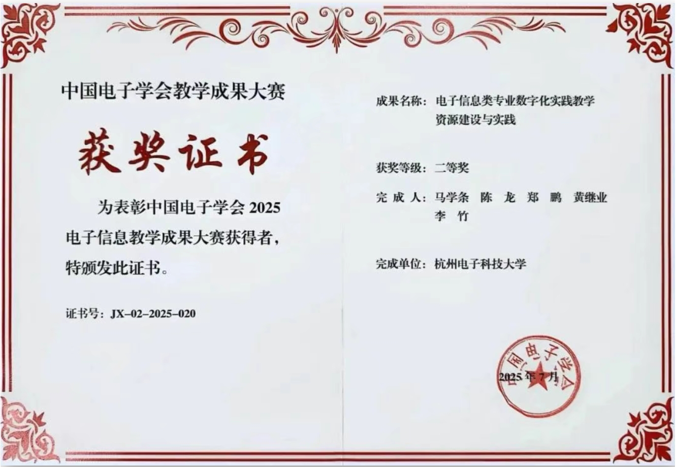 7月26日,中国电子学会2025电子信息教学成果大赛颁奖典礼在成都举行。我校电子信息学院游彬教授、马学条高级实验师牵头完成的两项教学成果从全国200余项参赛成果中脱颖而出,分别荣获一等奖和二等奖,充分彰显了我校在电子信息领域教育教学改革和人才培养方面的突出成效。