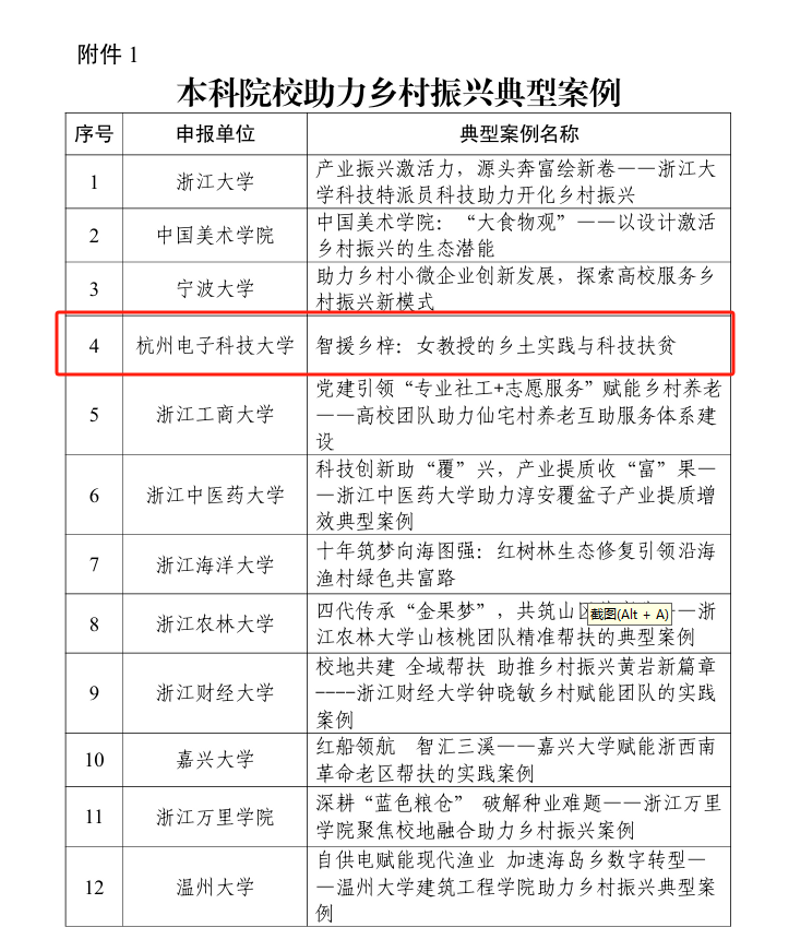 10月21日,浙江省教育厅公布第四届高校助力乡村振兴典型案例评选结果。我校申报的案例《智援乡梓:女教授的乡土实践和科技扶贫》成功入选,成为全省15个本科院校典型案例之一。这也是我校第三次获此殊荣。